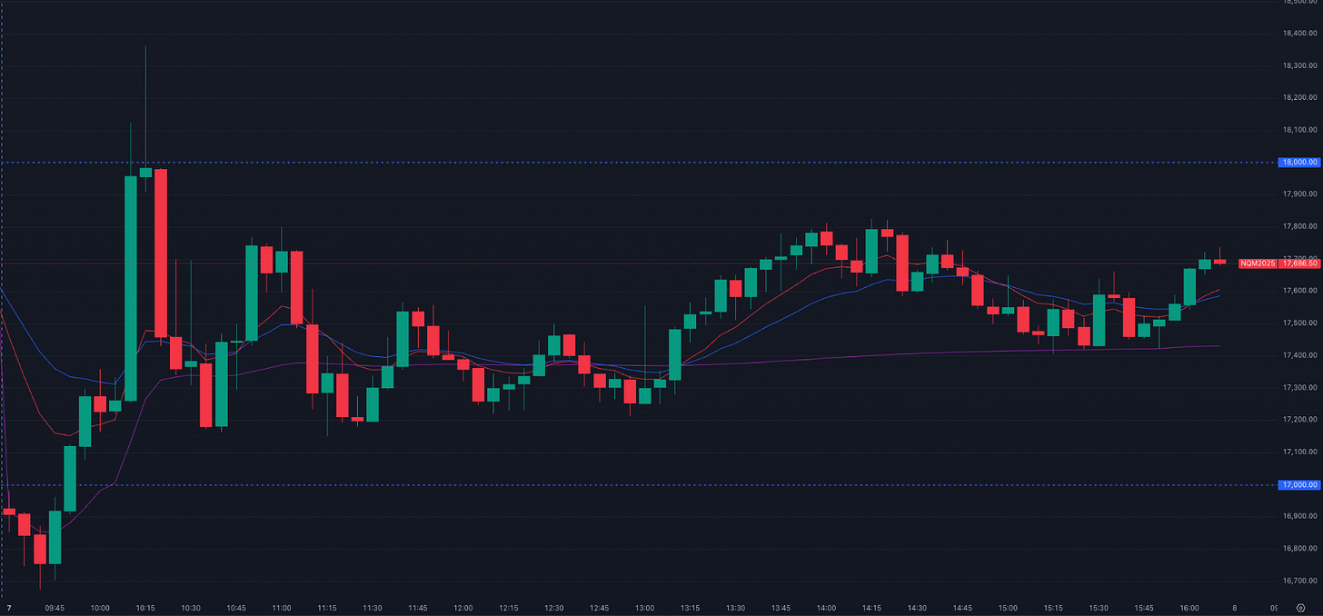 Once those tails were established, the range was locked in. From about 11:00am onward, the market chopped sideways, holding between roughly 17,200 and 17,800 into the close.