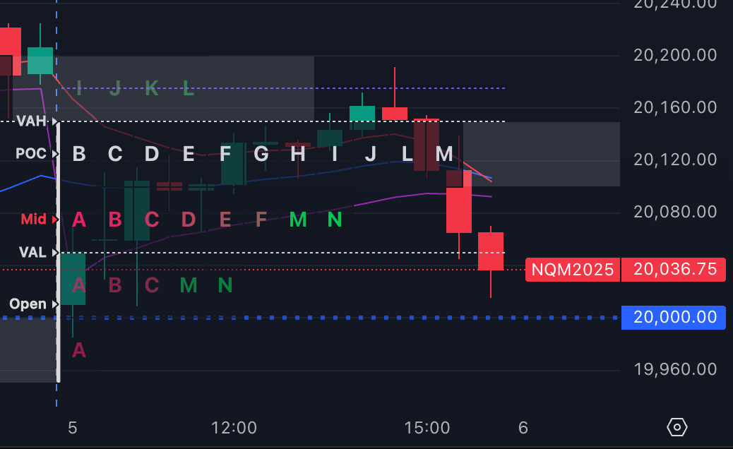 Monday was a Nontrend Day — the market stayed largely within the initial balance, with only a brief upside extension before settling back inside during the final three TPOs.